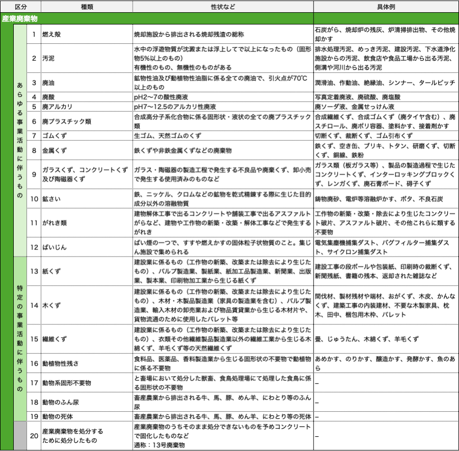 産業廃棄物は、廃棄物処理法で定められた20種類を指します。