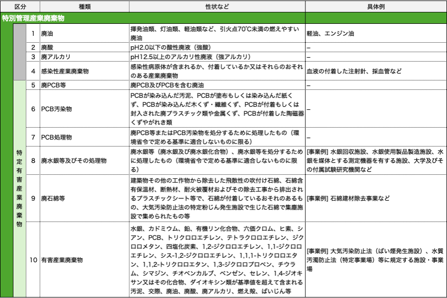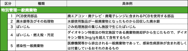 特別管理一般廃棄物として分類される廃棄物の種類と具体例は、以下の通りです。