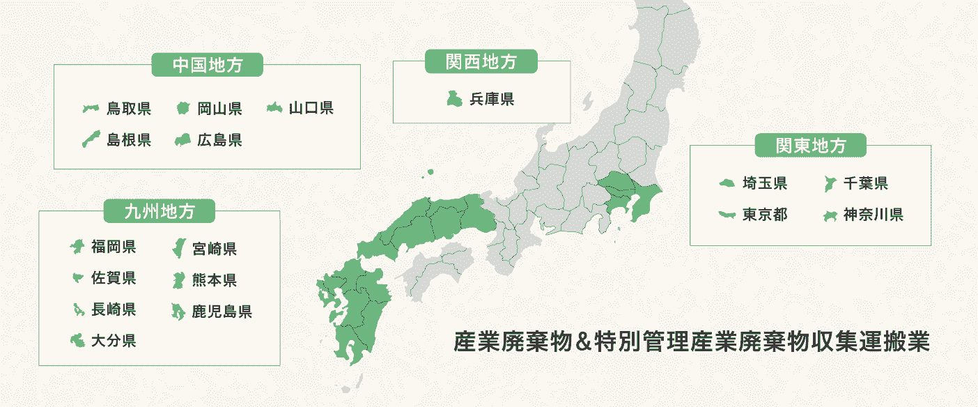 九州・中国エリアを中心に、関東圏の少量廃棄物も対応可能です。